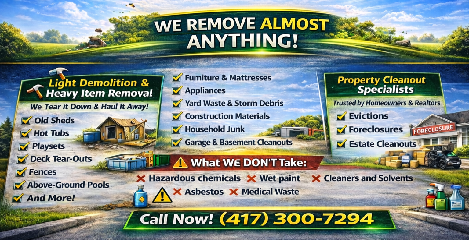 Mattresses ~ Old Furniture ~ Electronics ~ Hot Tubs ~ Deck Tear Outs ~ Appliances ~ Garage Cleanouts ~ Old Sheds ~ Yard Waste ~ Storm Debris ~ Evictions ~ Foreclosures ~ Estate Cleanouts ~ Business and Residential ~